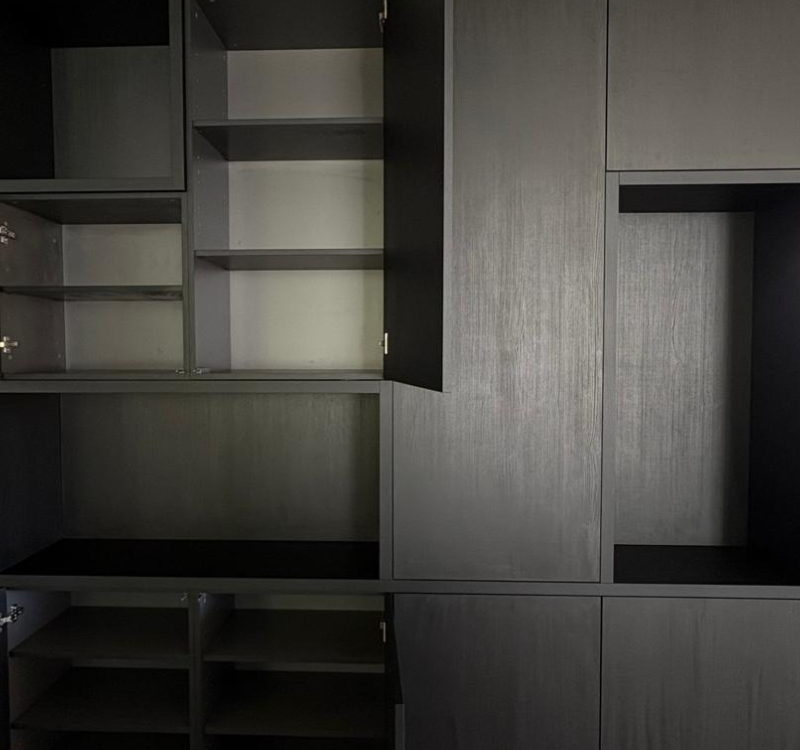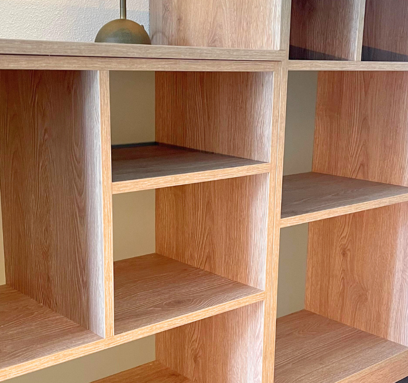 Op maat gemaakte wandkasten, volledig zelf samen te stellen in materiaal en afwerking.